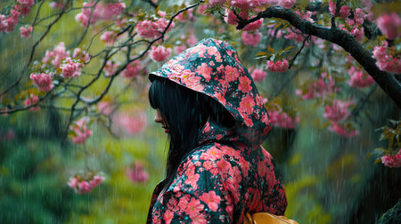 Young woman in a floral-patterned raincoat standing under a blooming tree in the rain, the colorful flowers contrasting with the dark sky