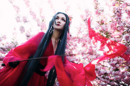 Young woman portrays geisha dressed traditional kimono with Japanese samurai sword in her hand against background of blooming sakura trees. Backlight.
