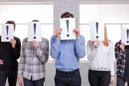 A group of people close their faces with sheets with an exclamation point. Stand next to an arrow close-up
