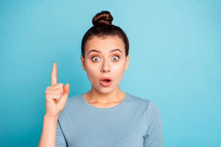 Close up photo beautiful she her lady arm hand finger indicate up empty space not believe proposition buy buyer low prices black friday wear casual sweater pullover isolated blue bright background