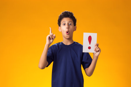 Portrait of surprised kid boy holding exclamation point card and showing finger up. Education and curiosity concept