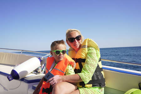 close up portrait young beautiful caucasian woman and little son having a ride on speed boat. Mother and child dressed in orange protective vessel