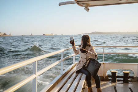 woman sitting on a ferry boat crossing the bosphorus and taking photo using her phone