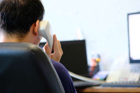 rear view unrecognizable young woman in office dialing on the phone lying on the desk calling her clients holding the headset.
