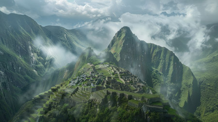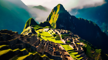 Machu Picchu magical ancient city with fog covering the high peak mountain on the background.