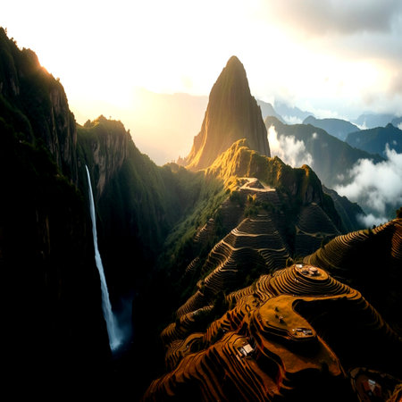 Mystical view on the Machu Picchu city ruins covered with fog with sun rays passing trough the clouds. Sacred city of Inca during the sunrise.