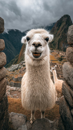 A fluffy alpaca gazes whimsically at the camera, surrounded by breathtaking mountains and lush green terraces. Its playful expression captures the charm of life in the Andes.