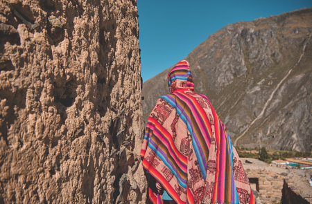 Traveler in poncho with backpack exploring ruins of Ollantaytambo Ruins in Sacred Valley of Peru. travel Concept