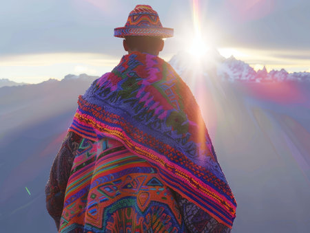 Peruvian Andean Poncho, Earthy Alpaca Wool, Symbolizes Connection to Pachamama, Envelops Shaman in Sacred Mountain Ritual, 3D Render, Backlights, Double Exposure Effect, Overtheshoulder shot