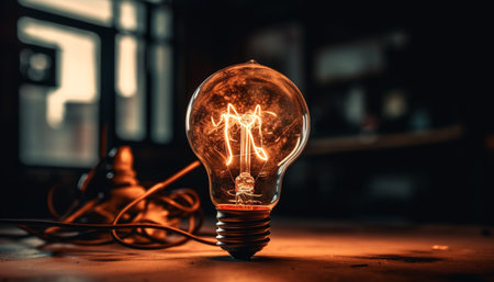 Bright glowing filament illuminates old fashioned tungsten electric lamp indoors at night generated by artificial intelligence