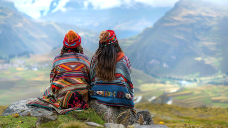 Indigenous peoples of Peru, Young women portrait in traditional clothes is sitting on stone and admiring landscape