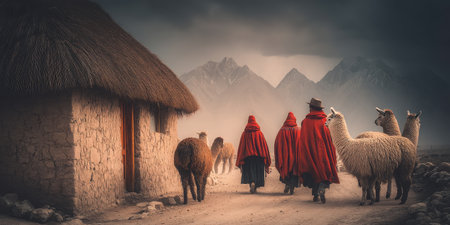 Immerse yourself in the enchanting scene of Andean culture with villagers in traditional dress walking alongside llamas against a backdrop of majestic mountains.