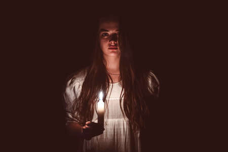 A young scary girl in an old white dress holding a candle in her hand and staring in to the camera. Dark background. Scary horror concept.