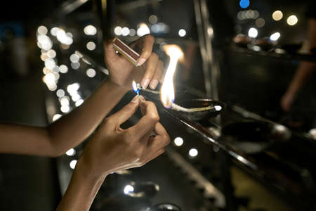The flame of a small burning match in a womans hands. Woman protects the fire from the wind. Dusk, shooting outdoors. Blur, noise, defocus, grain effect.