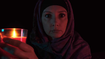 dark terrible witch with candles in her hands performs an occult mystical ritual