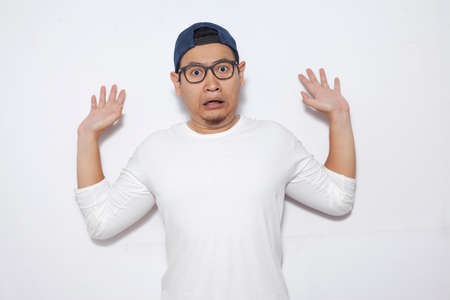 Photo image of young funny Asian man afraid expression with hands raised up, surrender, while standing over white background