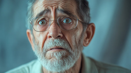 Portrait of adult bearded man with emotion of saddness on face looking at camera