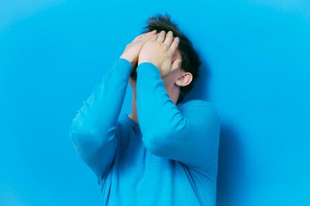 Portrait of a stressed Sad bald man on blue background, covering eyes with hands, headache, Shame, drowsiness