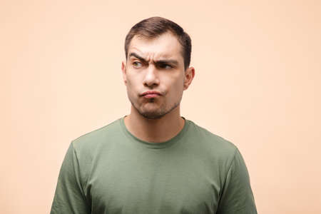 portrait of disgruntled man with pouting lips in green T-shirt on beige background, copy space