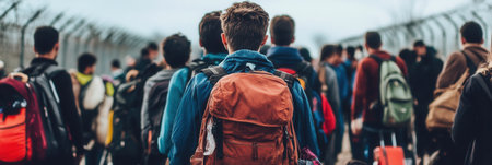 Crowds of refugees carry their belongings while facing challenges at a crowded border crossing, reflecting struggle and resilience.