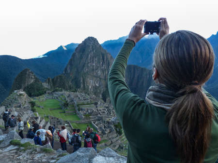 Unidentified people visit Machu Picchu in Peru. Machu Picchu is one of the most visited tourist sites in the world.