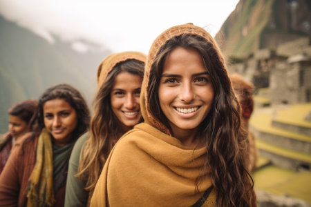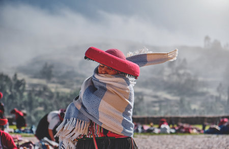 Indigenous peoples of Peru, Young women portrait in traditional clothes is sitting on stone and admiring landscape