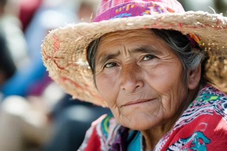 Elderly indigenous woman wearing a traditional straw hat and colorful clothing, showing wisdom