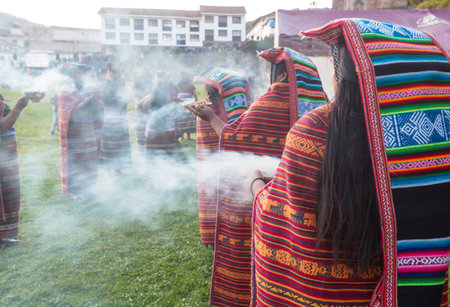 Peruvian dancers with traditional dress in the historical center of Cusco.