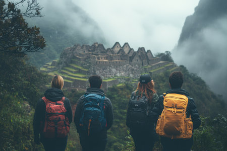 Four travelers stand on a ridge, gazing at an ancient archaeological site shrouded in mist. The atmosphere is serene, with lush greenery surrounding the historic structures.
