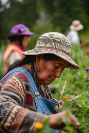 Indigenous leaders sharing traditional farming practices, advocating for food sovereignty and environmental stewardship.