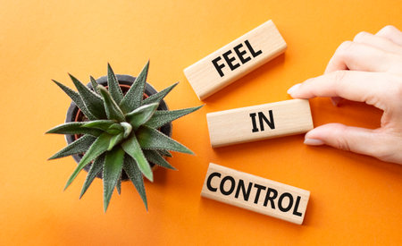 Feel in Control symbol. Wooden blocks with words Feel in Control. Beautiful orange background with succulent plant. Businessman hand. Business and Feel in Control concept. Copy space.