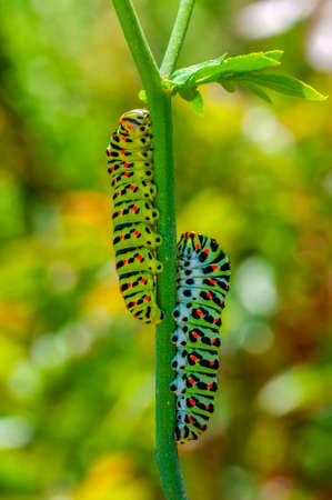 The caterpillar of the Papilio machaon butterfly crawling on green leaf in summer garden