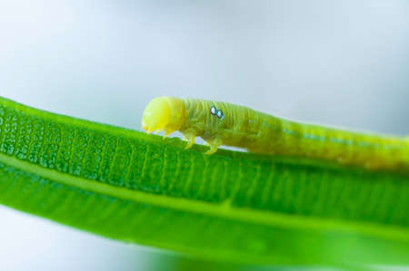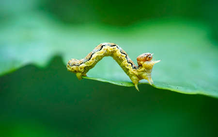 Worm on green leave, caterpillar species macro photo.