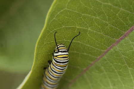 Monarch caterpillar, Danaus plexippus, in a butterfly garden on a flower in spring in Southern California, USA