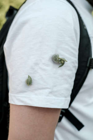 Thorny burdock bud stuck to a t-shirt, to a man shoulder. Close-up.
