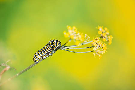 Black Swallowtail butterfly (Papilio polyxenes) caterpillar feeding on dill plant. Natural green and yellow background with copy space.