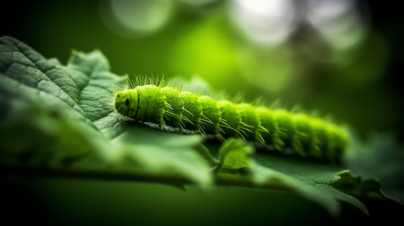 Long caterpillar munching on a vibrant green leaf, showing the details of its tiny mandibles and colorful body. Bright insect on plant close up, wildlife outdoor. Generative AI