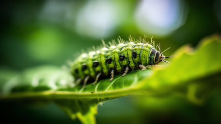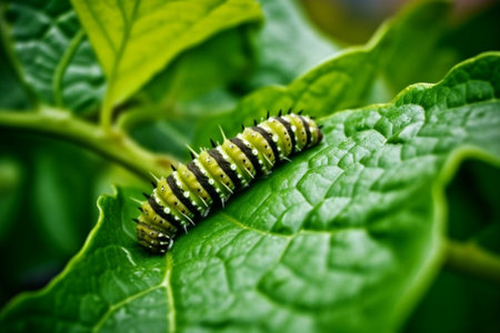 A vibrant caterpillar resting on a lush green leaf creates a striking image of nature's detail and beauty, showcasing the life cycle of these fascinating creatures.