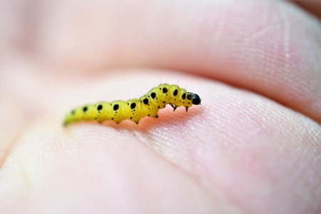 a lot of caterpillars of the box tree moth lying on the hand