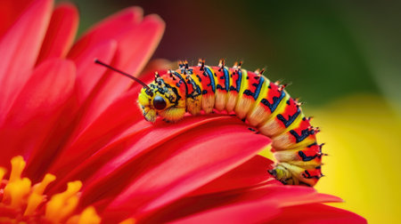 Brightly colored caterpillar crawling across a bright red gerbera daisy in full bloom