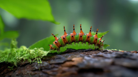 Colorful caterpillar on a green leaf, macro nature view. Wildlife and insect photography concept