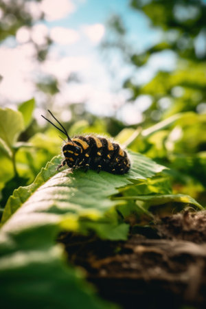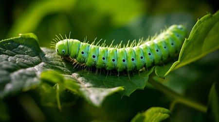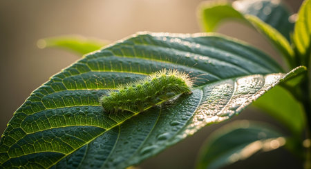 A caterpillar on a leaf in the sunlight, AI