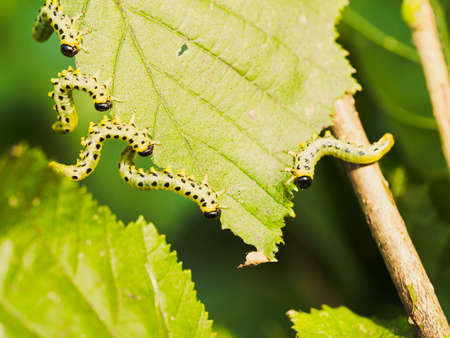 Many caterpillars, apple ermine, on one leaf of hazel, hanging curved. Apple moth caterpillars are yellow with a black head and black spots hanging from the leaf, macro. Shallow depth of field.