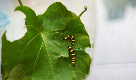 Yellow, red, black striped caterpillars are eating leaves. shot from high angle