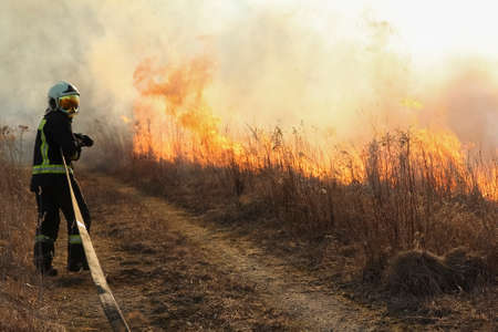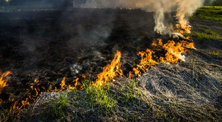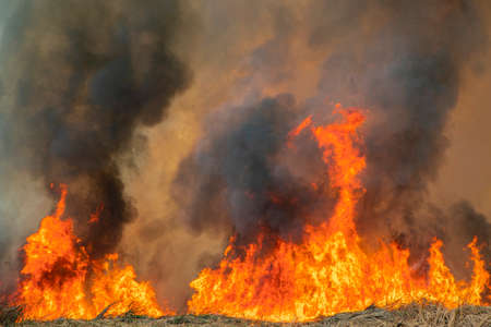 The raging flame of fire burn in the fields, forests and black thick acrid smoke.