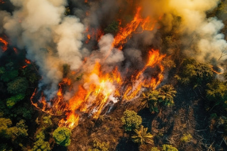 An aerial view presents a dramatic scene of a forest fire, with dense smoke swirling above lush greenery, capturing the urgent beauty and ecological impact of wildfire.
