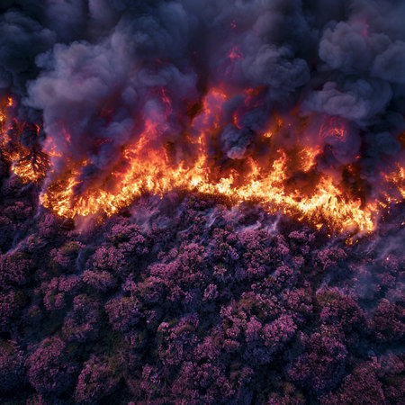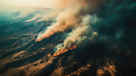 Aerial view of a wildfire spreading across a dry landscape, with thick smoke clouds covering the sky, illustrating the devastating impact of natural disasters.