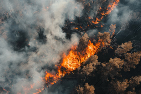 Aerial perspective of a forest fire showcasing flames and smoke rising among dense trees. This scene highlights the urgent impact of wildfires on ecosystems.
