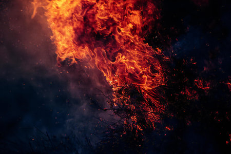 Captivating view of a wildfire with flames engulfing trees. Smoke fills the air, highlighting the destruction in nature's landscape. This dramatic scene showcases the intense heat and environmental effects of wildfires, emphasizing the urgency for conservation and prevention efforts.