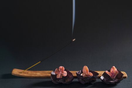 Aromatic religious stick on a black background in a wooden stand. Dry fragrant soothing flowers in the spa. The concept of zen and meditation